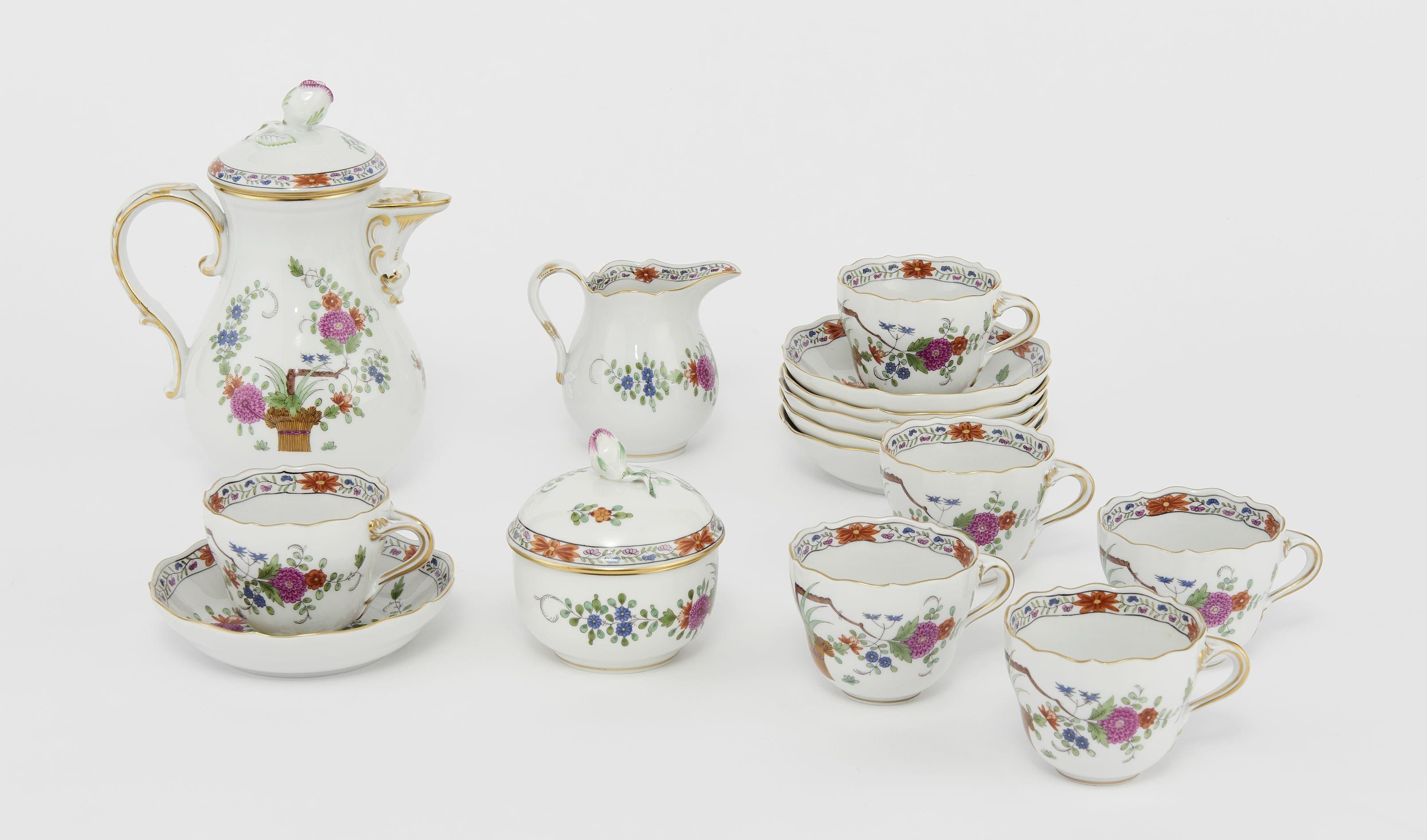 Meissen, XXe s, porcelaine, comprenant: 6 tasses, 1 cafetière, 1 pot à lait et 1 sucrier (9p). Provenance: collection Pernet-Villaverde