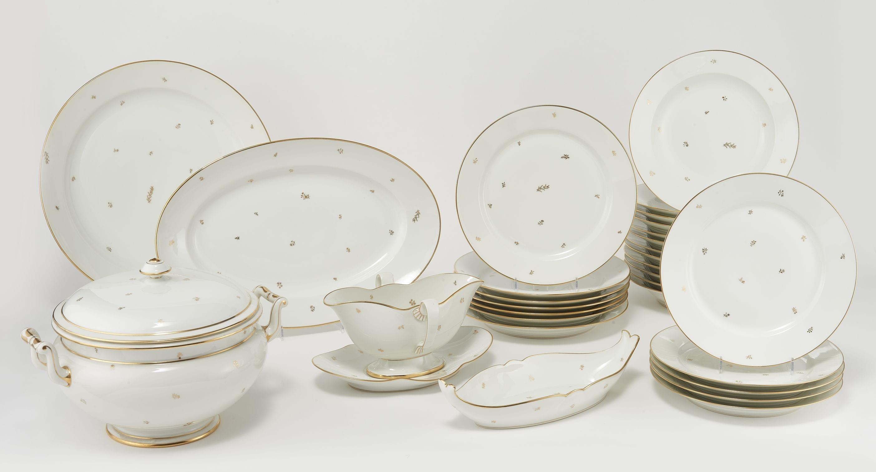 Manufacture nationale de Sèvres, 1947, porcelaine, comprenant: 30 assiettes à dîner, 12 creuses et 12 pièces de service (54p)