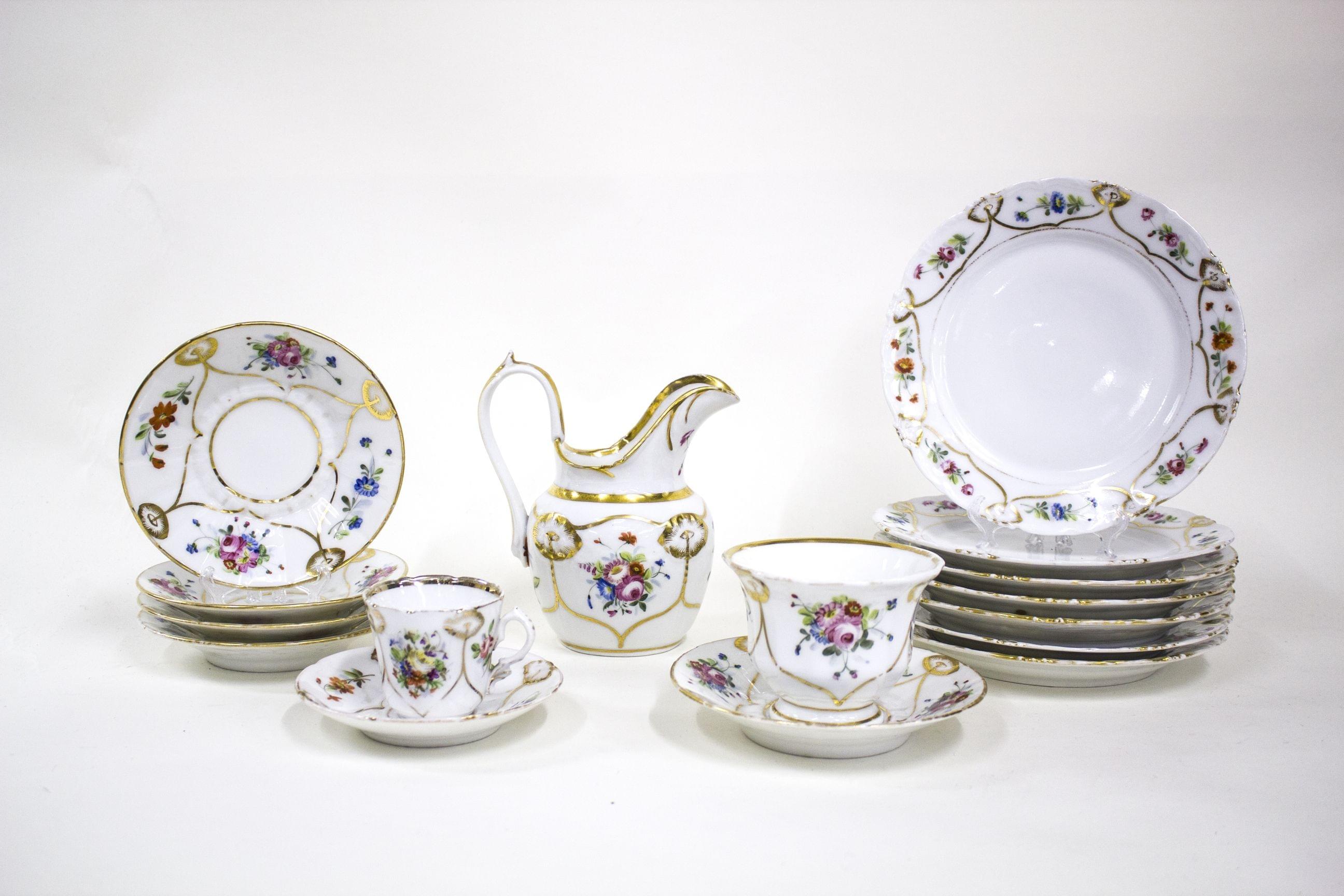 Paris, porcelaine, comprenant: 7 assiettes, 9 tasses et sous-tasses à thé, 6 tasses à café et sous-tasses