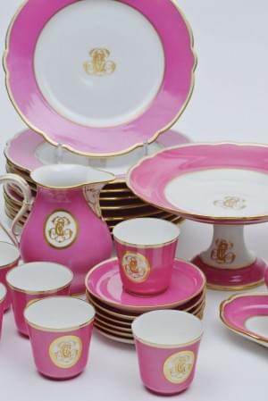 183. Service à dessert à marli rose et monogramme C doré au centre