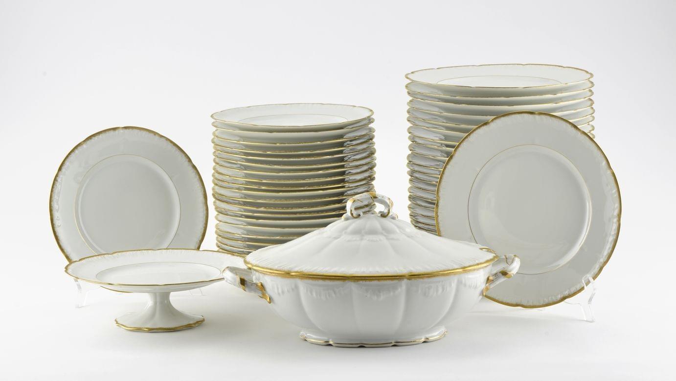 Porcelaine, comprenant: 23 assiettes à dîner, 24 à dessert, 12 c...