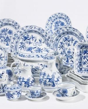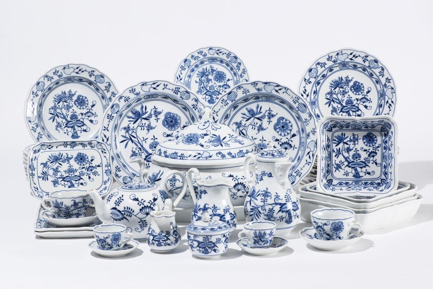 Meissen, République Tchèque, porcelaine Zwiebelmuster, comprenant: 10 assiettes à dîner, 8 creuses, 26 à dessert, 10 tasses à thé, 12 à café, 13 plats, 2 saladiers, 1 cafetière, 1 théière, 1 sucrier (84p)