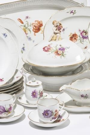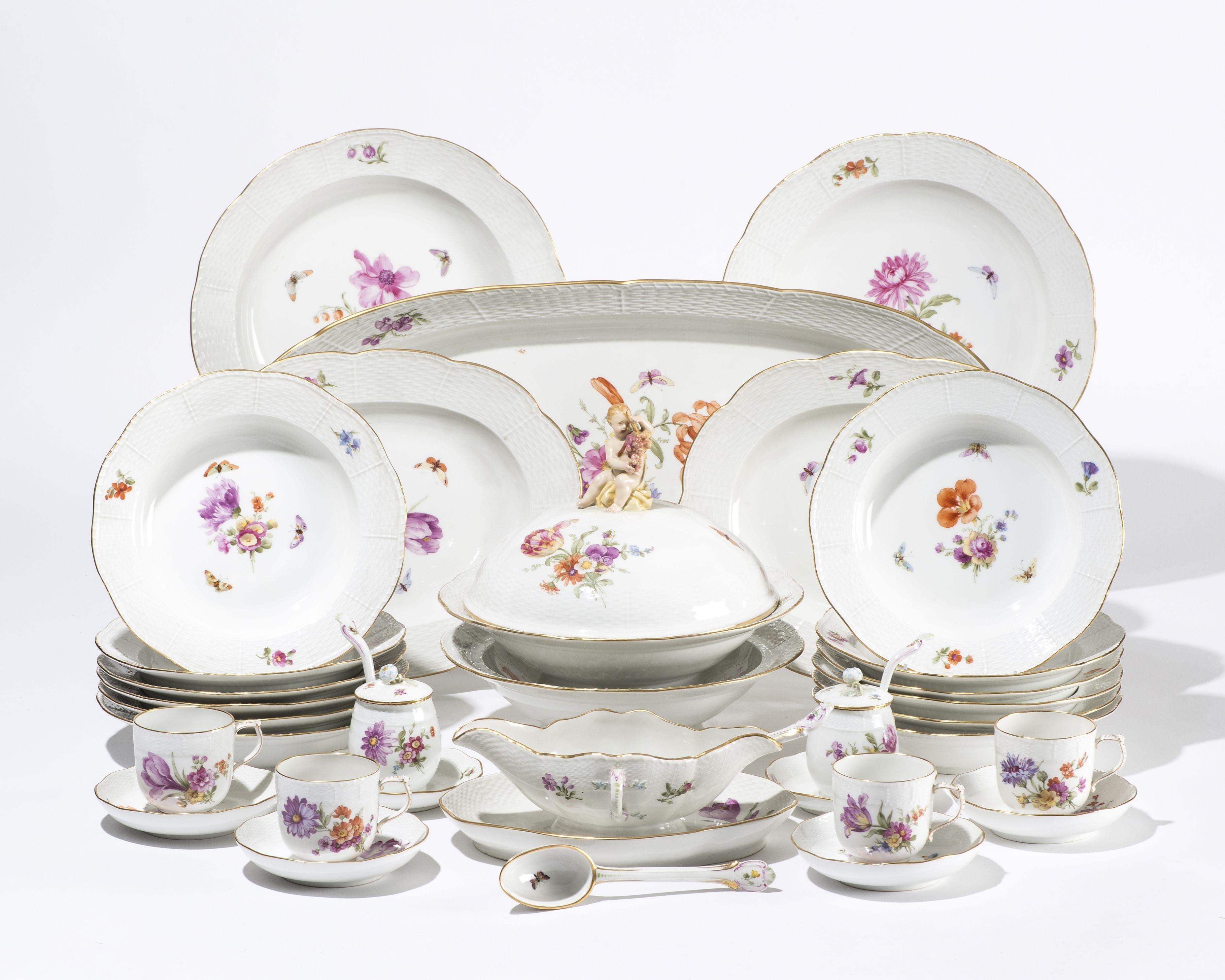 Berlin, KPM (Königliche Porzellan Manufaktur), porcelaine, comprenant: 12 assiettes à dîner, 12 creuses, 12 à entremets et 12 à pâtisserie, 12 tasses, 6 plats, 2 légumiers ronds à couvercle sommé d'un chérubin, 4 jattes carrées, 2 moutardiers, 4 cuillères (80p)