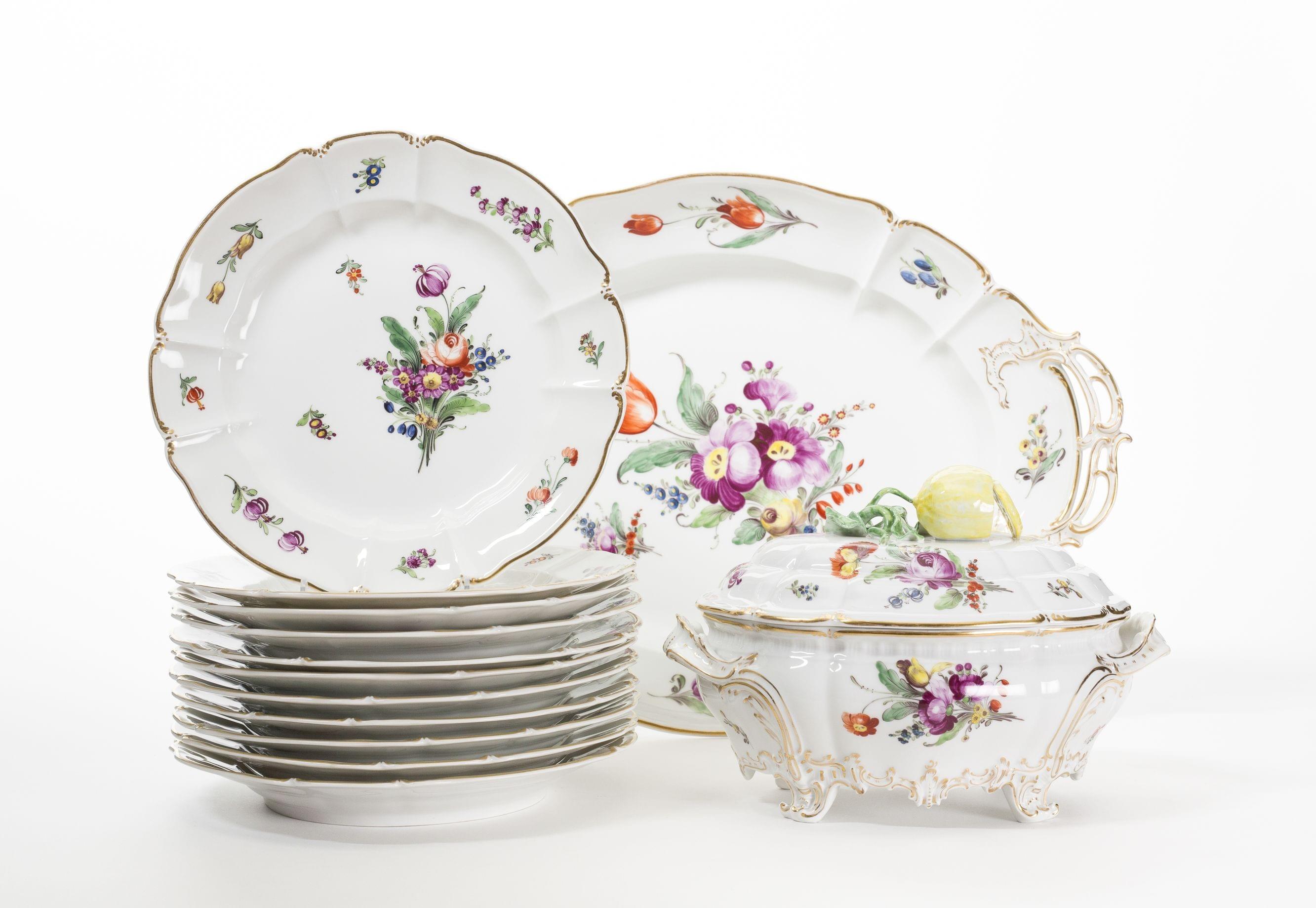 Meissen, porcelaine, circa 1735, comprenant: théière boule, choc...
