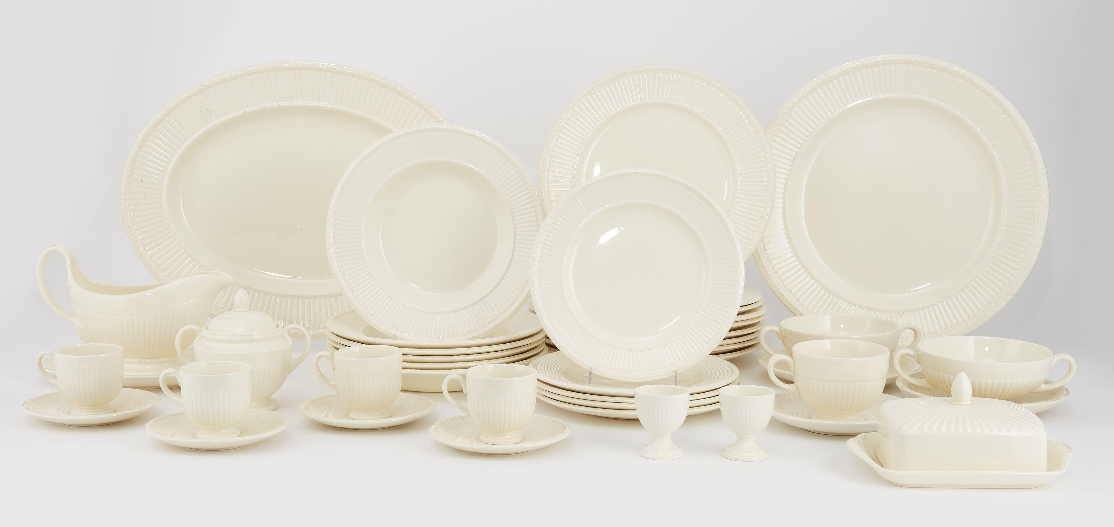 Wedgwood, faïence fine, comprenant: 18 assiettes à dîner, 18 creuses, 18 à dessert, 18 tasses à café, 18 à thé, 18 à bouillon, 5 pièces de service (113p).