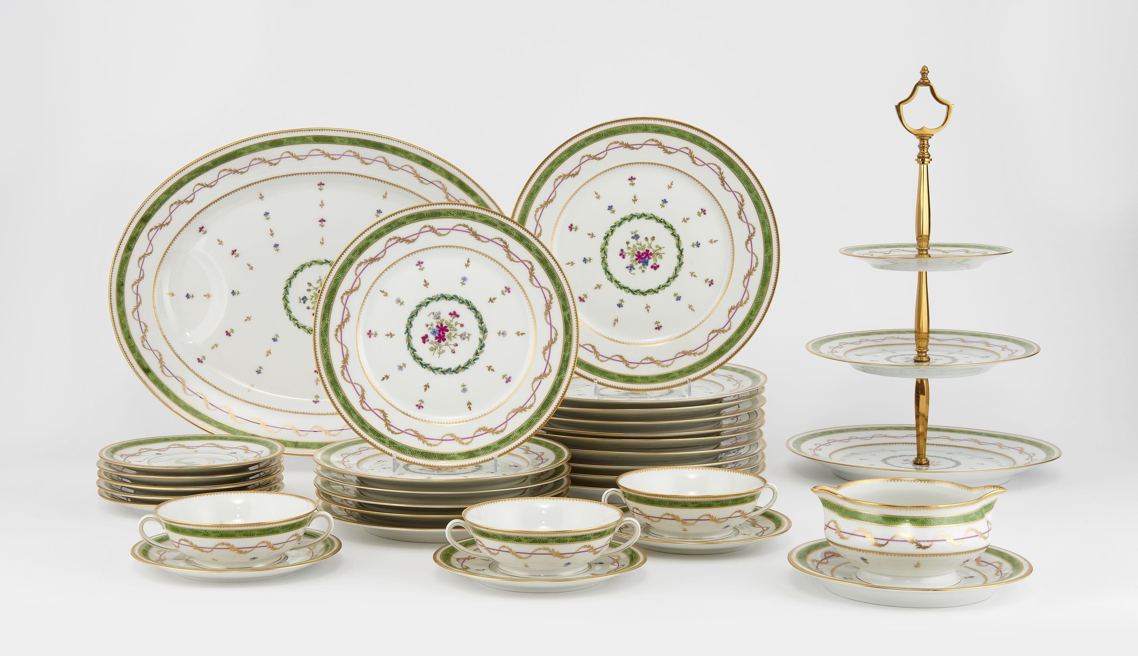 Haviland, Limoges, porcelaine, comprenant: 18 assiettes à dîner, 18 à entremets, 12 tasses à bouillon et 8 pièces de service (56p).