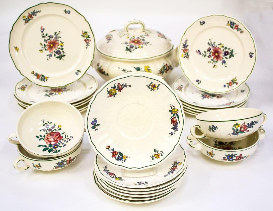 Villeroy & Boch, porcelaine, comprenant: 6 assiettes à dîner, 6 à dessert, 6 tasses bouillon et 1 soupière (19p)