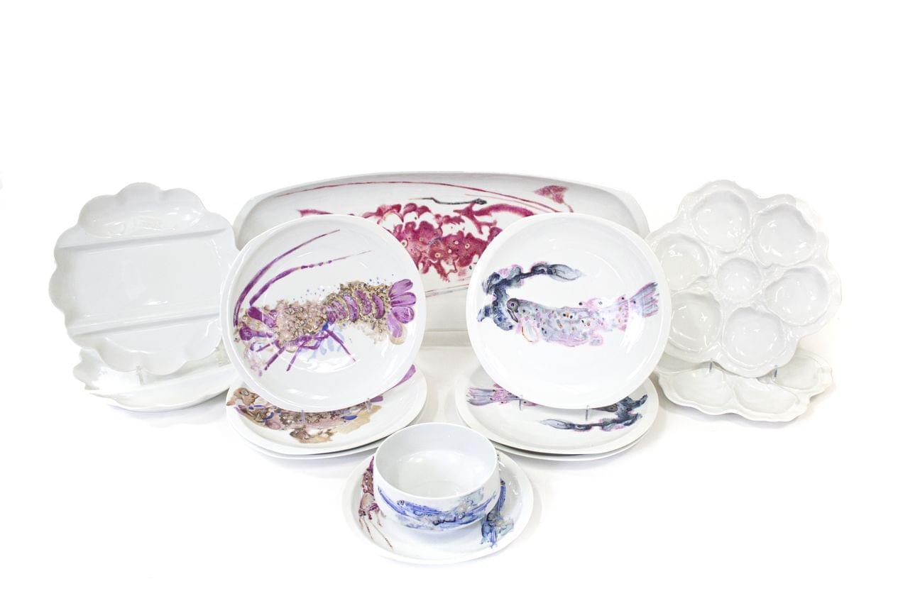 Bernardaud, Limoges, dessin Chièze et Pradier, porcelaine, comprenant 12 assiettes, 1 plat et 1 saucière. On joint 12 assiettes à huîtres et 12 à asperges en porcelaine blanche (38p).