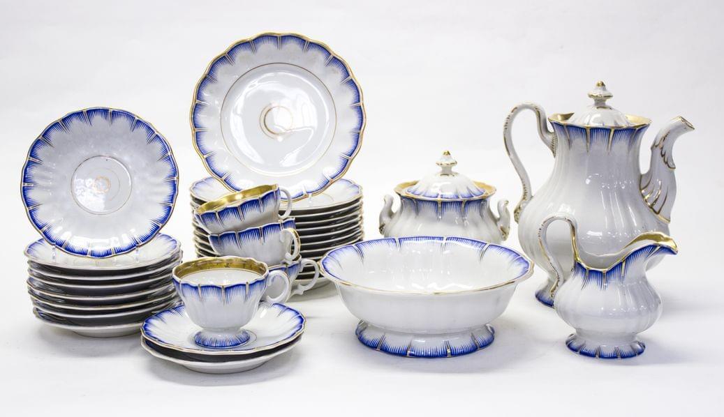 Fürstenberg et Friedrich Adolf Schumann, Allemagne, porcelaine à motif bleu et or, comprenant: théière, cafetière, sucrier, crémier, jatte et 12 assiettes