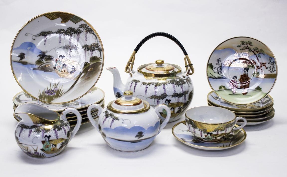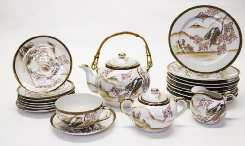 Japon, porcelaine à décor d'oiseaux, comprenant: 16 assiettes à pâtisserie, 8 tasses à thé, 1 théière, 1 crémier et 1 sucrier. On joint 6 assiettes et 5 tasses d'un service assorti (38p)