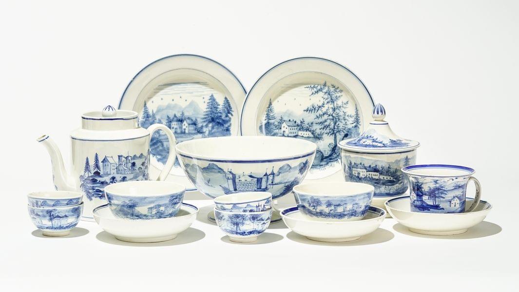 Nyon, début XIXe s, faïence, comprenant: théière, sucrier, jatte, 4 bols à thé, 2 bols, 2 assiettes, 1 tasse à anse (12p)