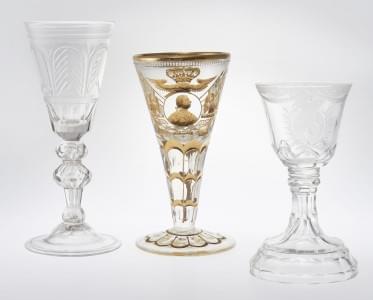 830. 3 grands verres à vin à décor gravé de fleurs, armoiries et méda...