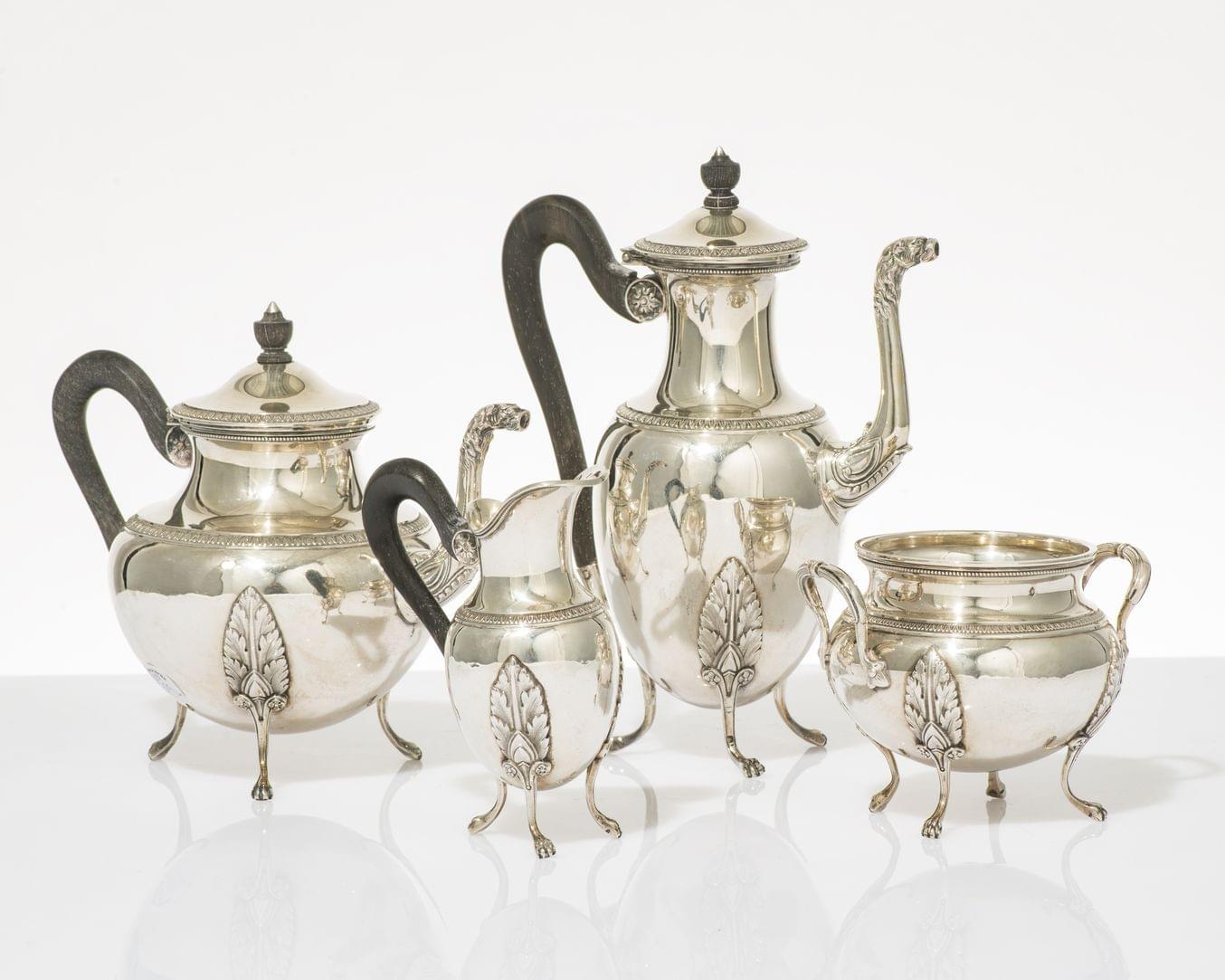 569. Service à thé de style Empire à bordure de feuilles d'eau et bec verseur zoomorphe, Boulenger, Paris circa 1900, argent et bois noirci, comprenant : théière, cafetière, sucrier et crémier, 1300 g