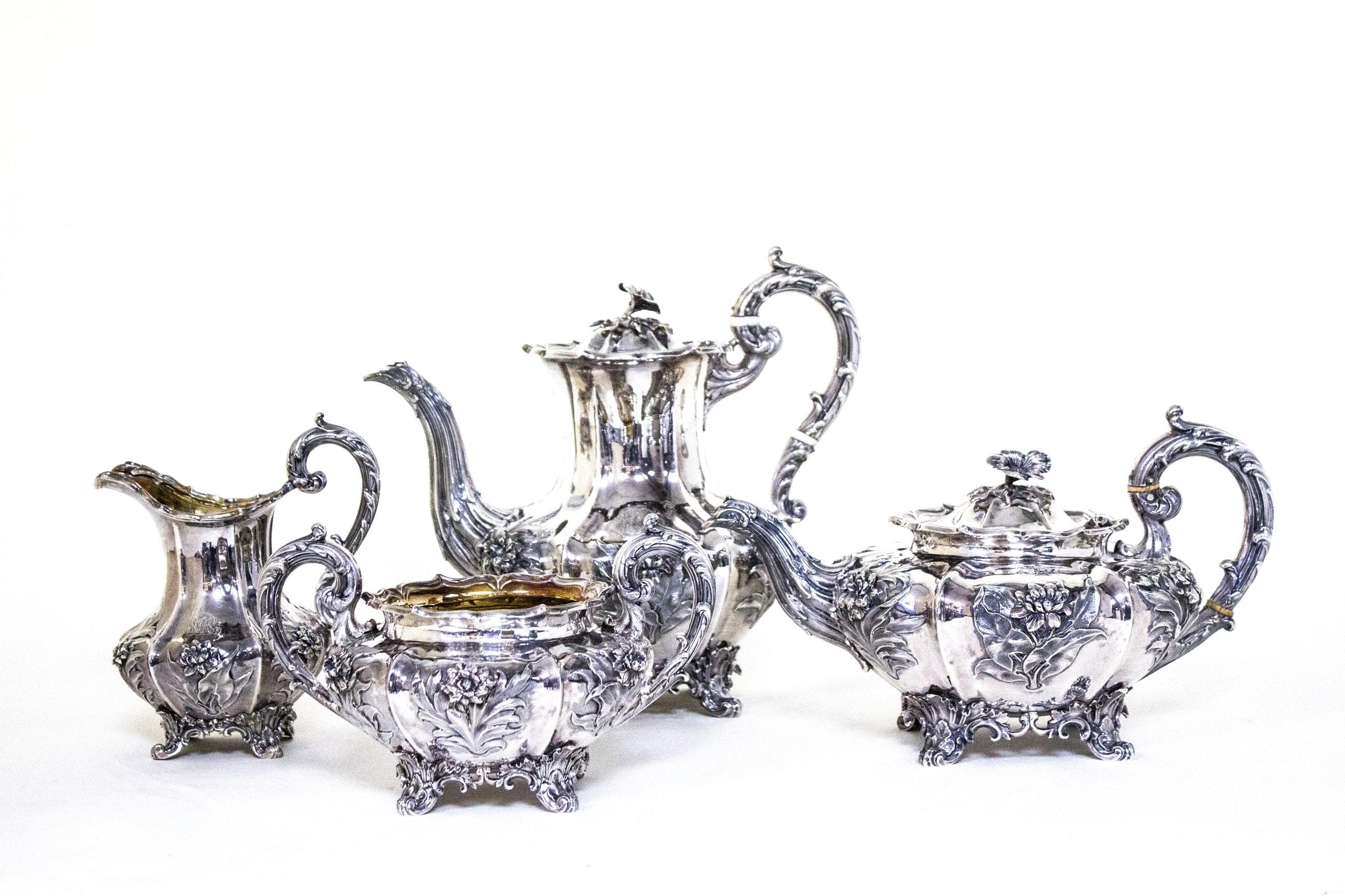 600. Service à thé d'époque George IV à décor repoussé et ciselé de fleurs