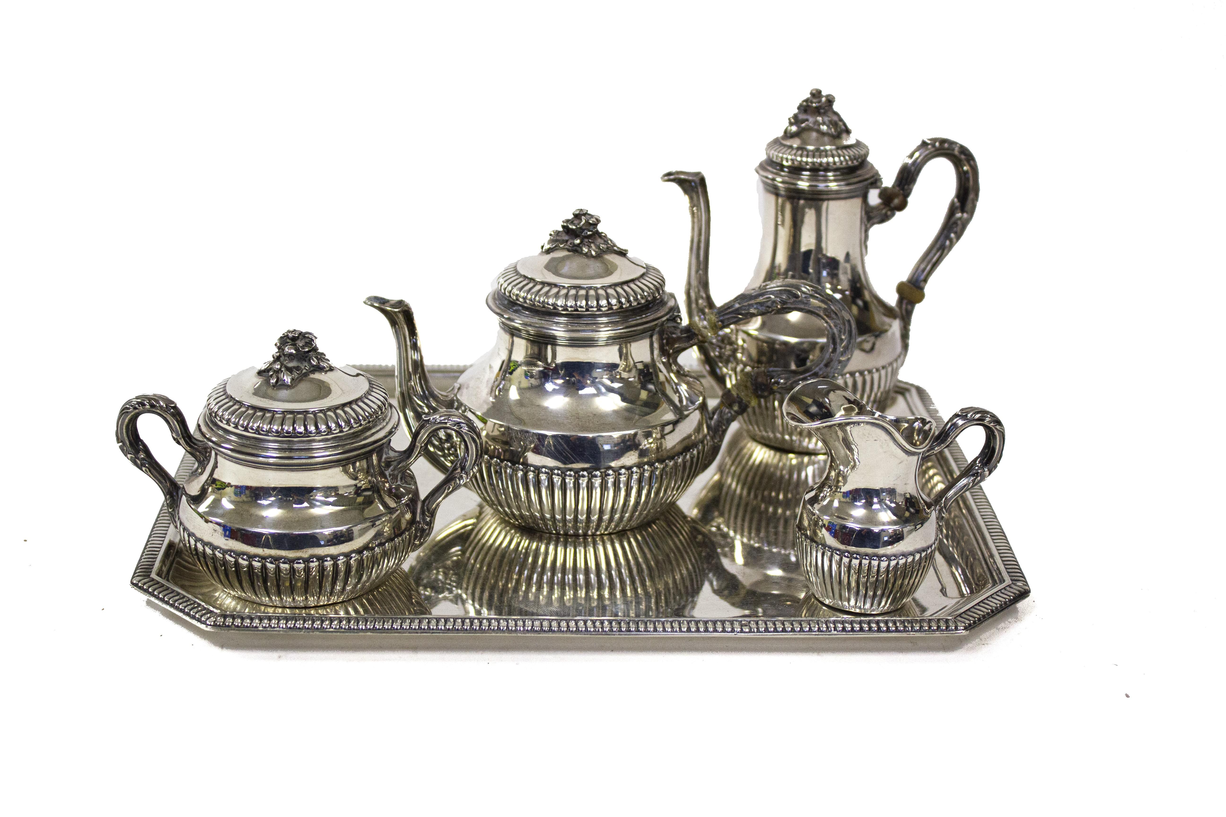 France, argent, comprenant: théière, cafetière, sucrier, crémier et plateau, 1400 g, H 14 cm, L 30 cm