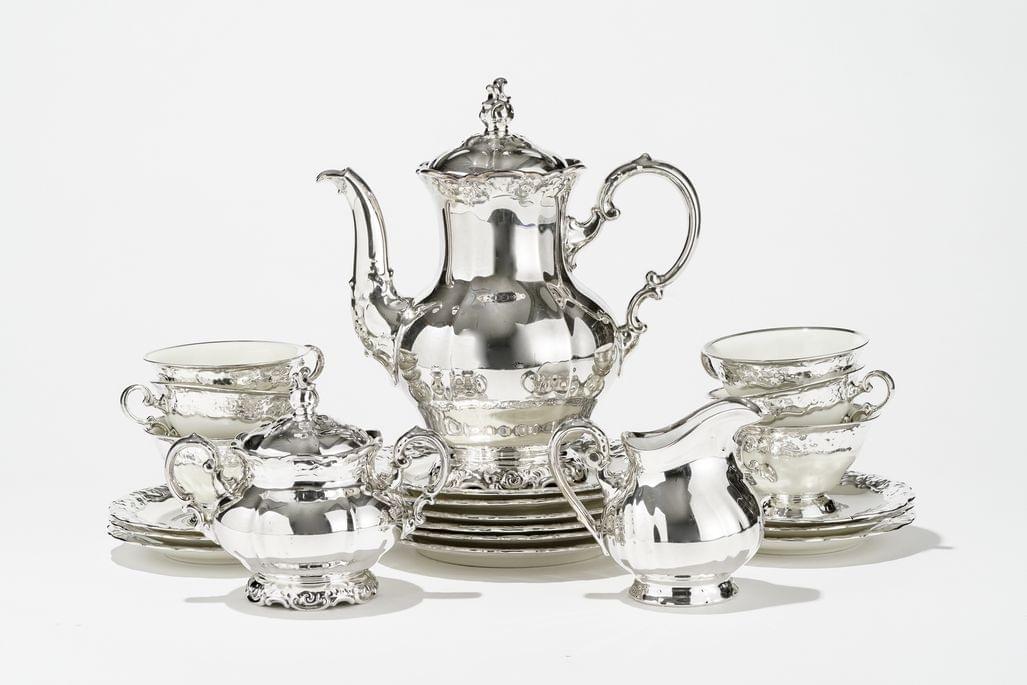 3193. Service à thé en porcelaine argentée à décor de volutes