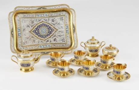 Probablement Iran, argent et vermeil, comprenant: théière, cafetière, sucrier, 6 tasses et plateau, 3400 g (10p)