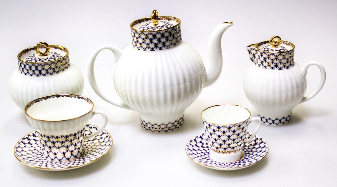 3185. Service à thé et café en porcelaine à motifs de croisillons bleu et or,