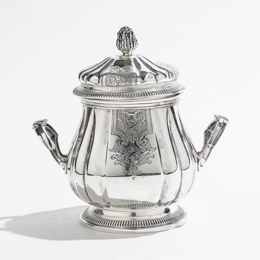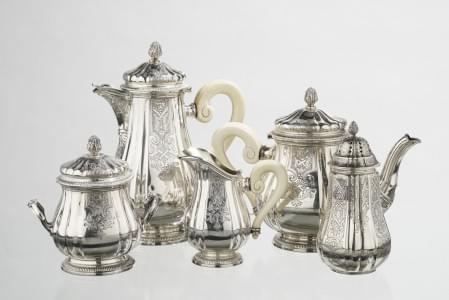 405. Verseuse et 4 tasses à décor corail et or de l'aigle impériale d...