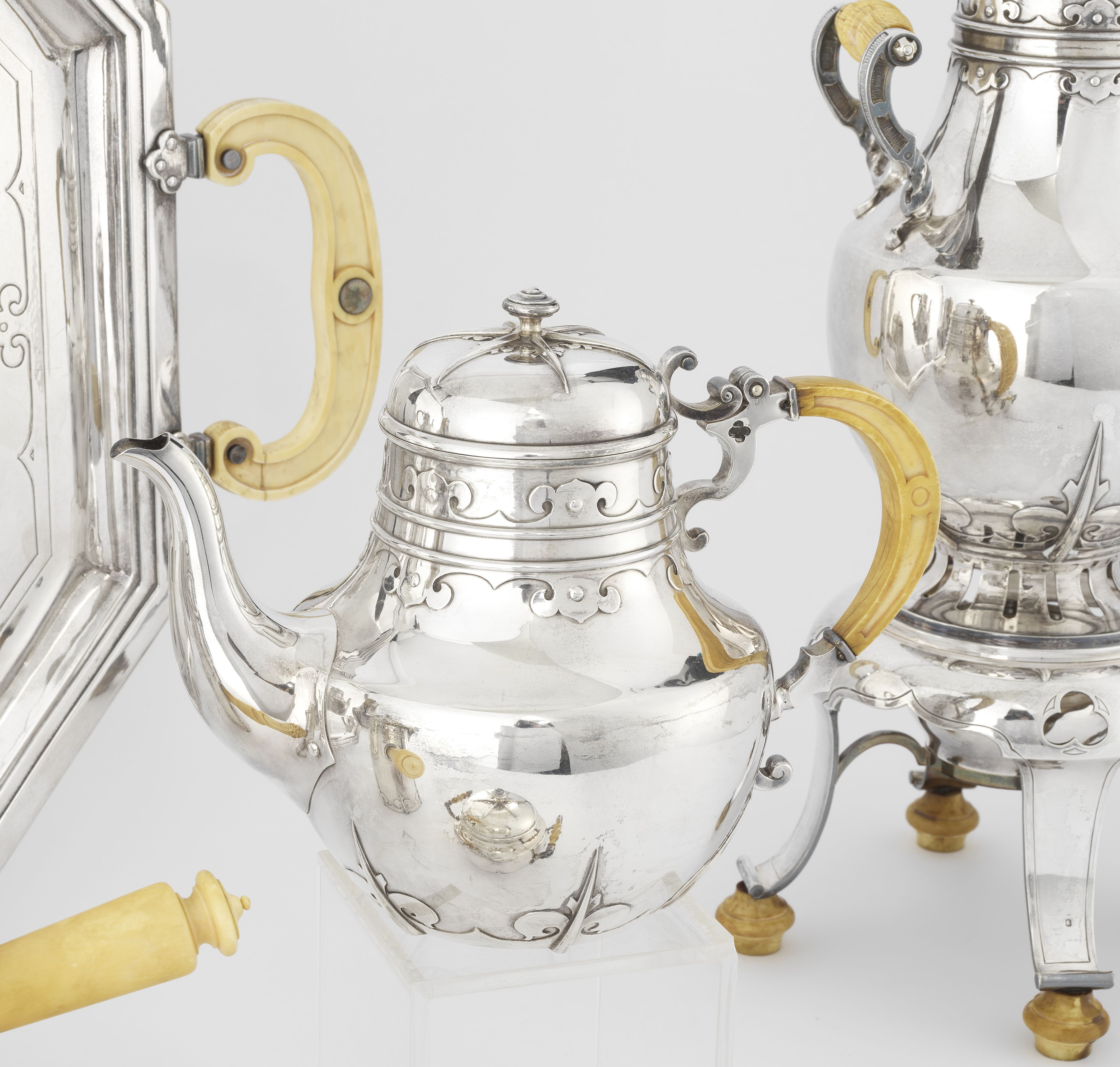 Métal argenté, comprenant: théière, cafetière, sucrier, crémier...