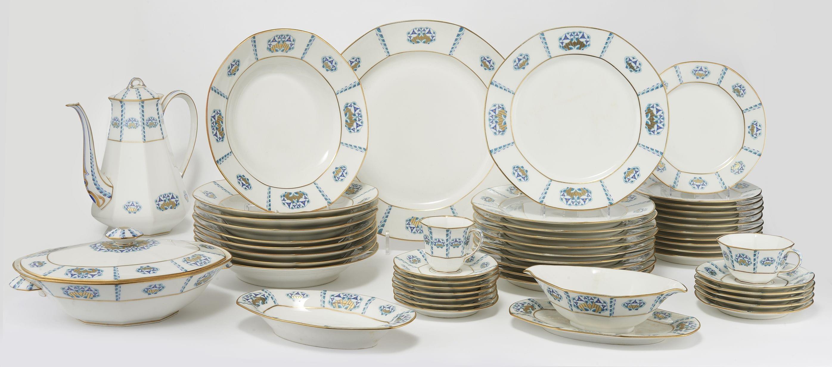 Service Art déco à décor de motifs stylisés dans des parecloses, Limoges, France, Porcelaine comprenant: