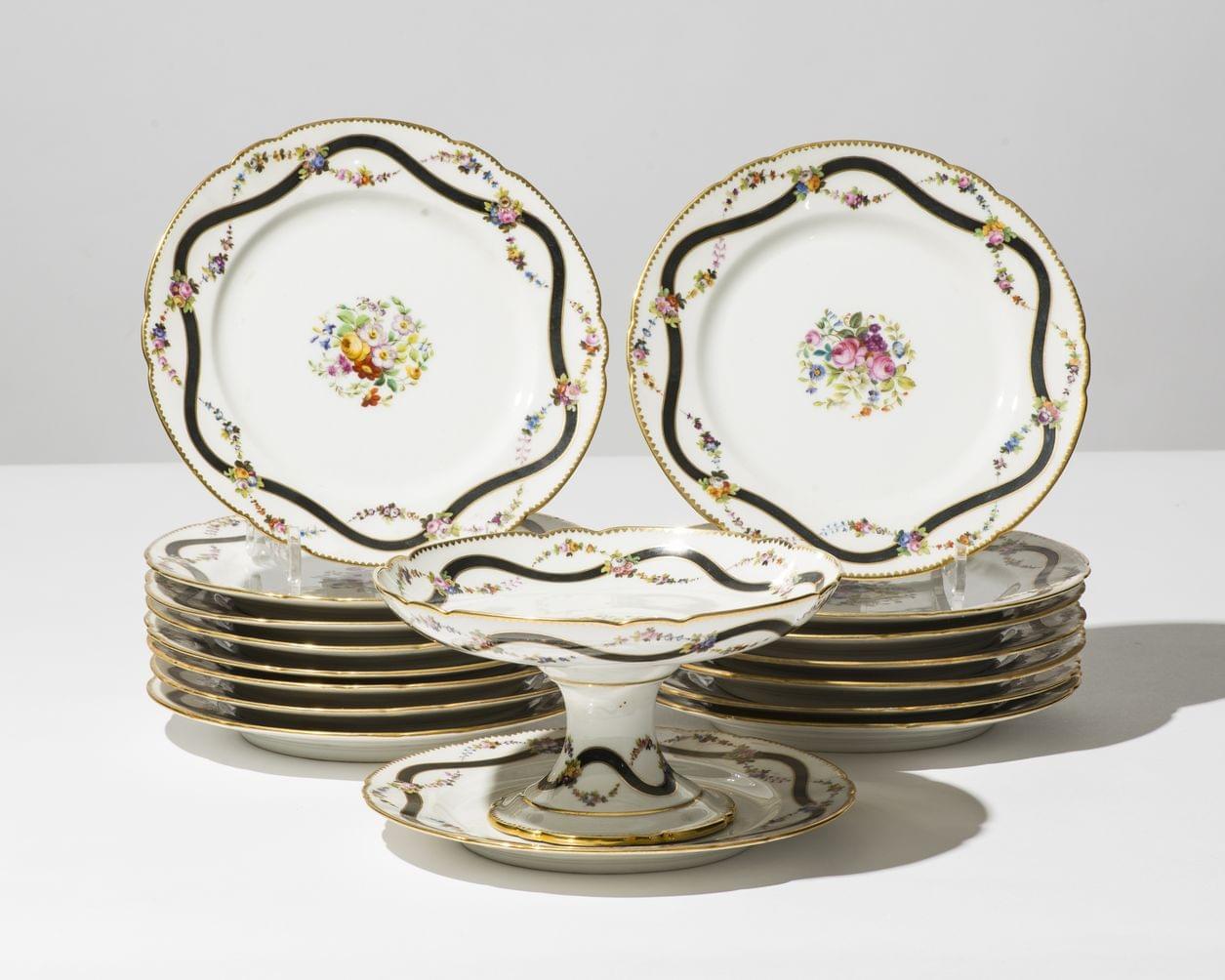 539. Service de 16 assiettes et 1 compotier à décor de ruban noir et guirlandes de fleurs