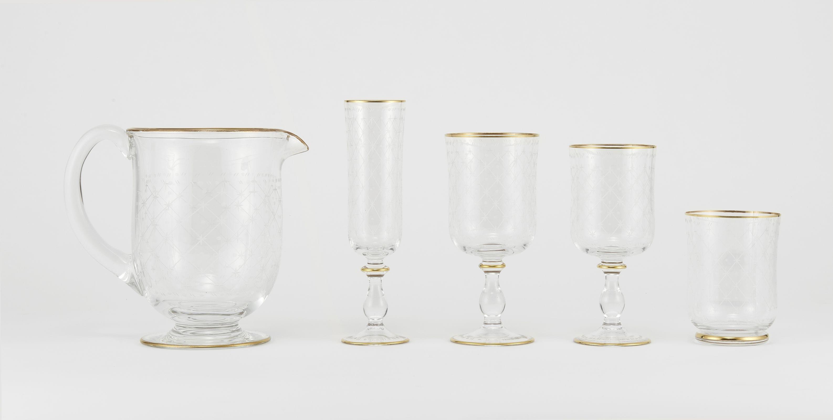 Venise, verre soufflé et gravé, comprenant: 10 verres à vin rouge, 10 à vin blanc, 10 à eau, 10 flûtes à champagne et 1 broc (41p)