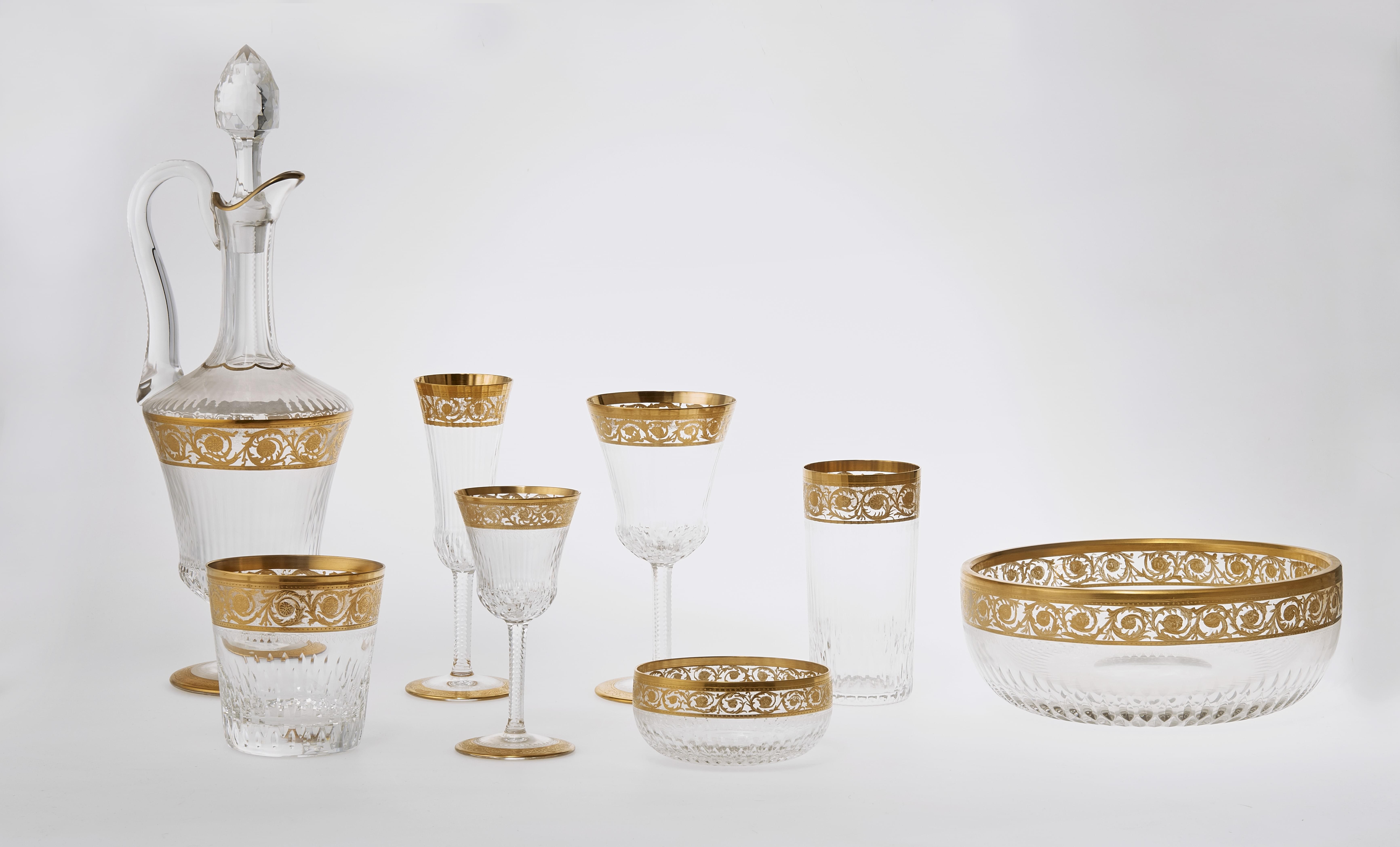 Saint-Louis, cristal taillé et doré, comprenant: 12 verres à vin rouge, 12 à vin blanc, 12 flûtes, 6 verres à whisky, 4 verres à orangeade, 6 coupelles (52p)