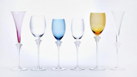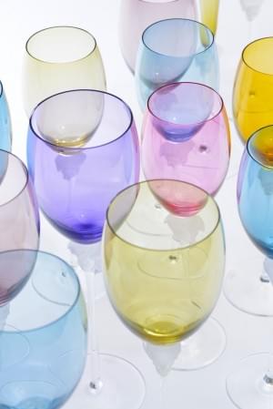 comprenant: 16 verres à vin rouge de couleurs et 14 transparents, 15 verres à vin blanc de couleur et 16 transparents, 9 flûtes à champagne de couleur et 15 transparentes, 21 verres à eau à frise grecque dorée (106p)