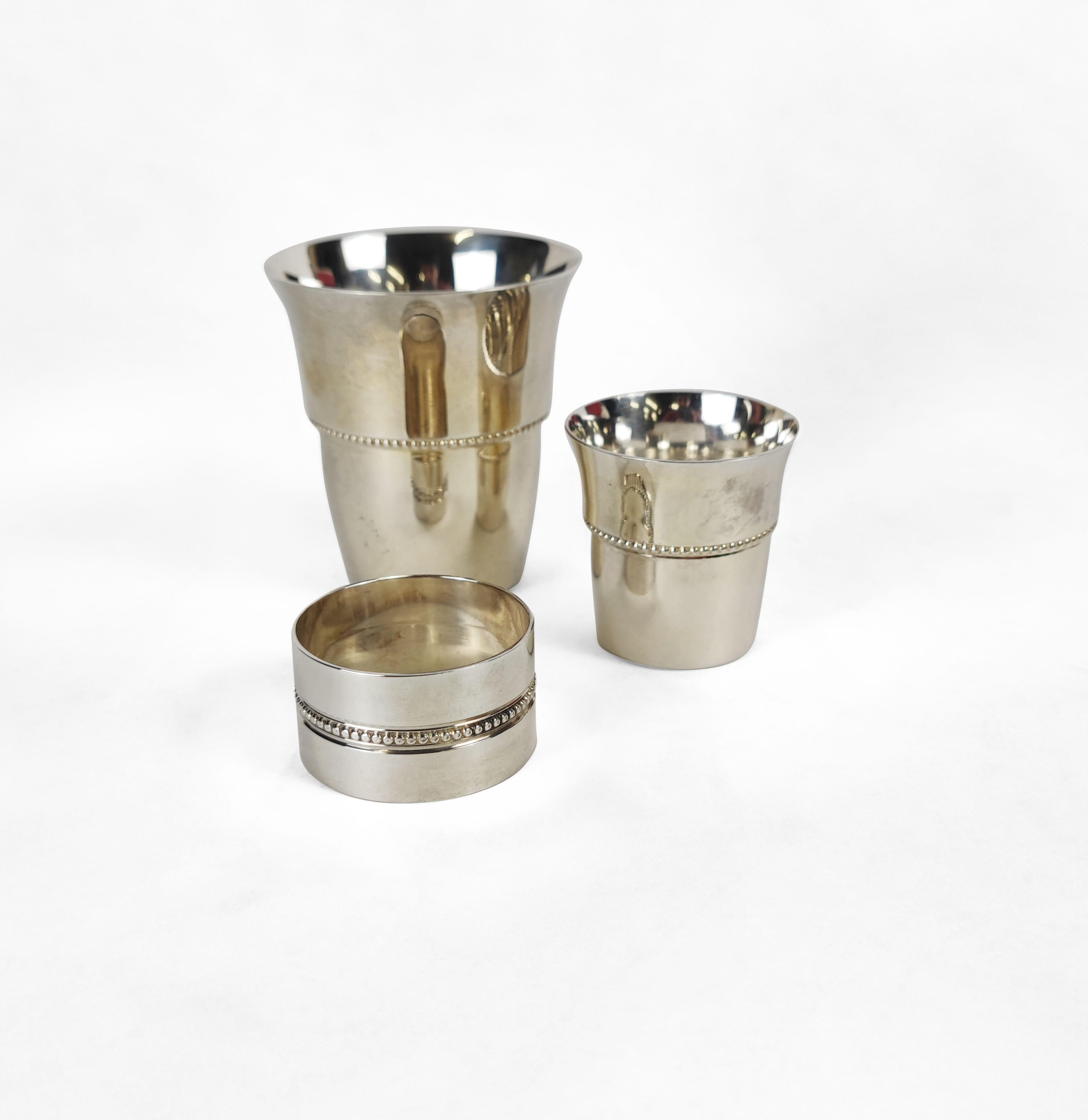 St-Médar, métal argenté, comprenant: une grande, une petite timbale et un lien de serviette, D de 4 à 6,5 cm