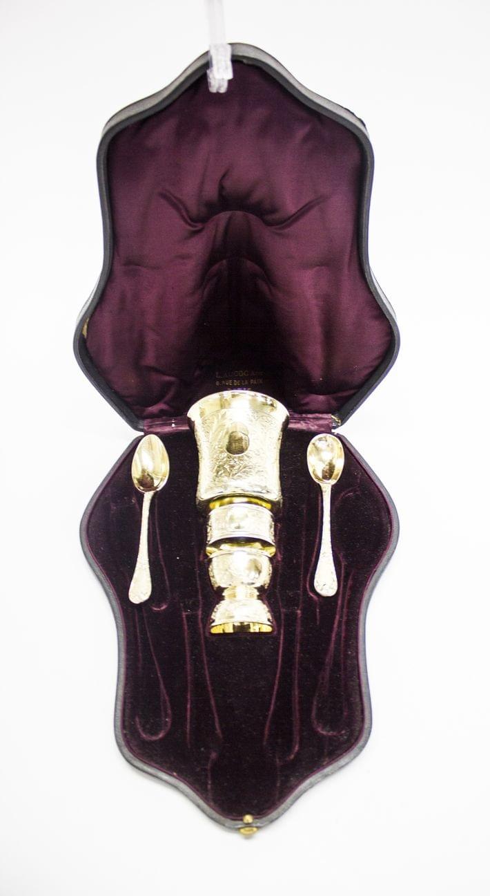 comprenant: timbale, coquetier, lien de serviette et deux cuillères, dans un écrin Aucoc Paris, vermeil, 260 g