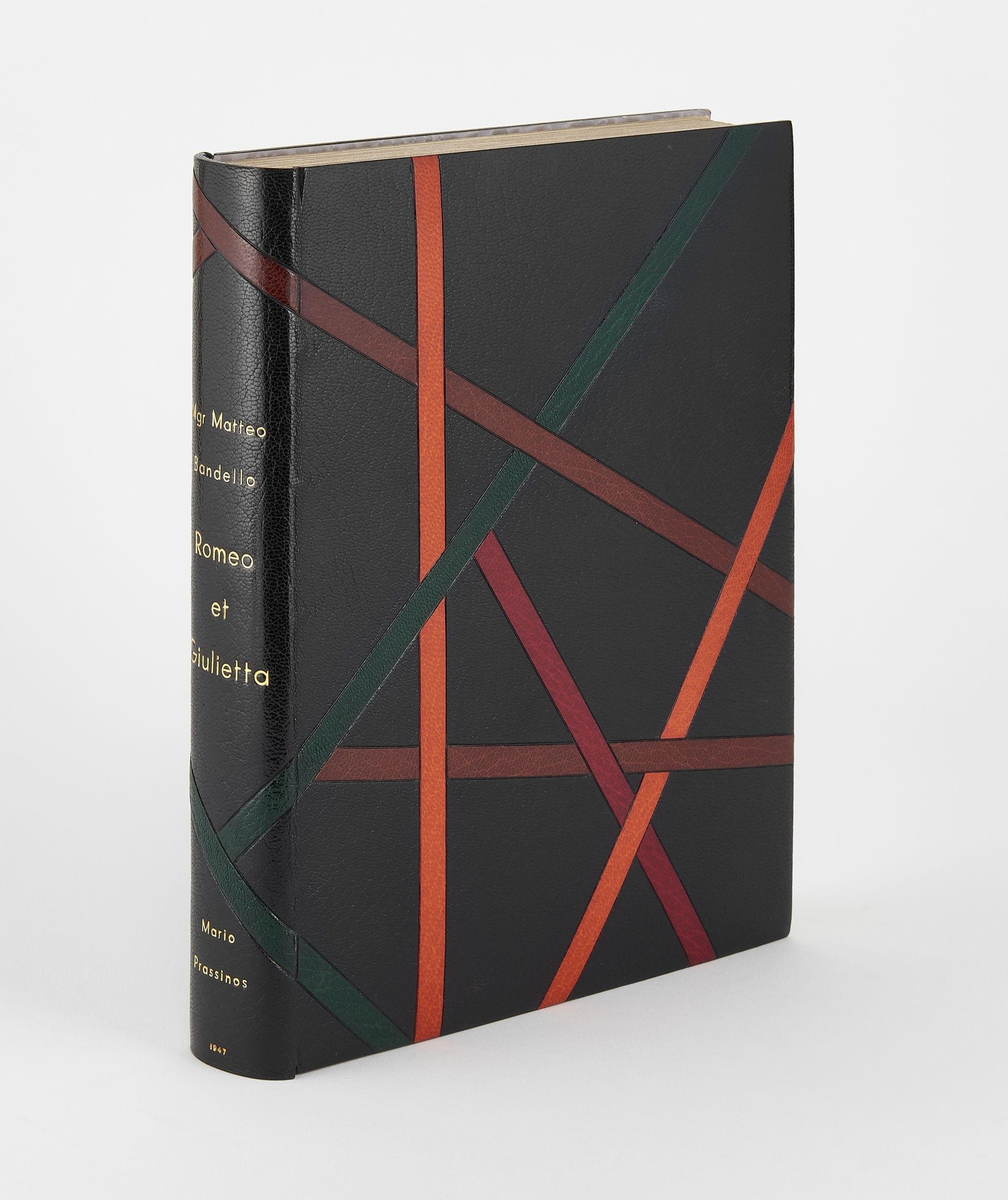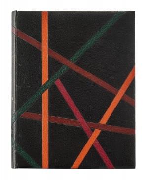 In 4°, mar. noir à décor de larges filets de mar. mos. de couleurs différentes, gardes de veau gris brillant, tr. dorées, couv. et dos cons., chemise et étui.