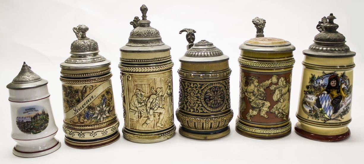 Terre vernissée à décor de personnages, étain, H de 13 à 20 cm