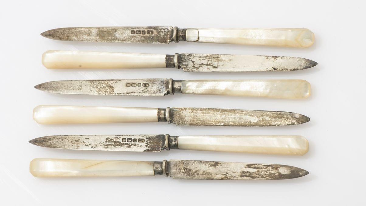 Verre blanc moulé-pressé patiné, signés, H 5 cm