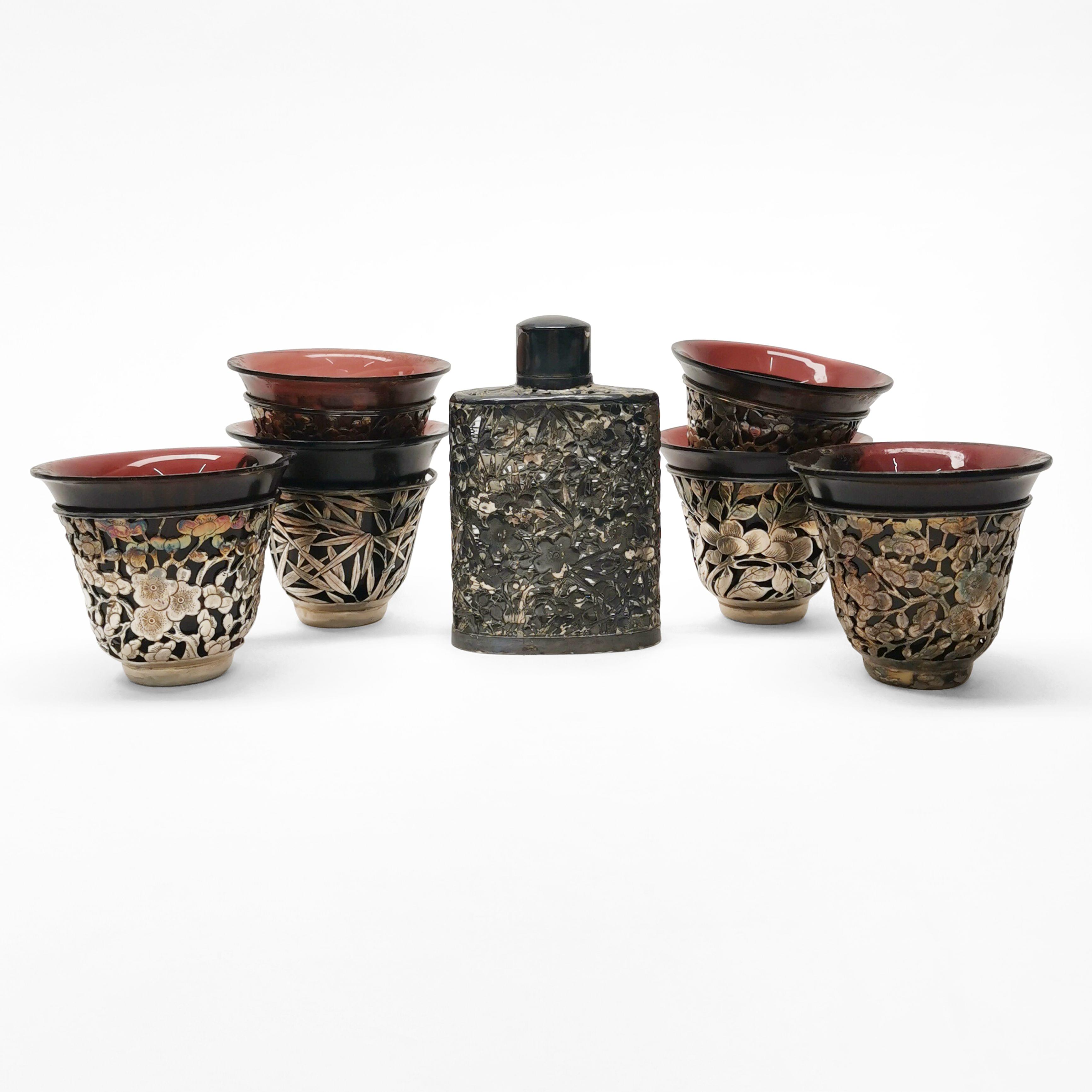 Argent ajouré à motif de bambou et fleurs et verre, D 8,5 et H 12 cm pour le flacon