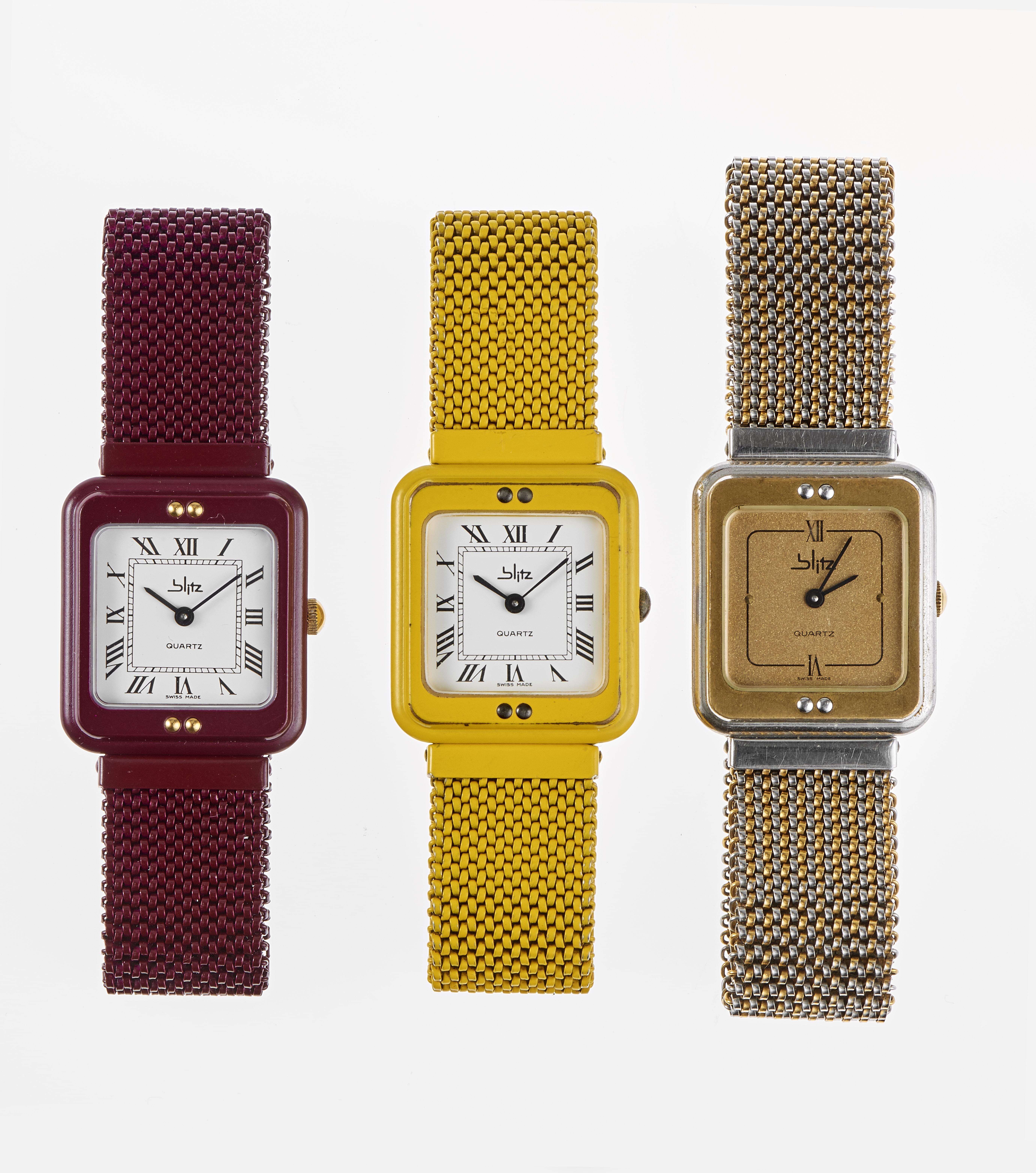 Deux à cadrans blancs et une à cadran doré, aiguilles et chiffres romains noirs, bracelets extensibles jaune, bordeau, et doré argenté, acier, 28x25 mm
