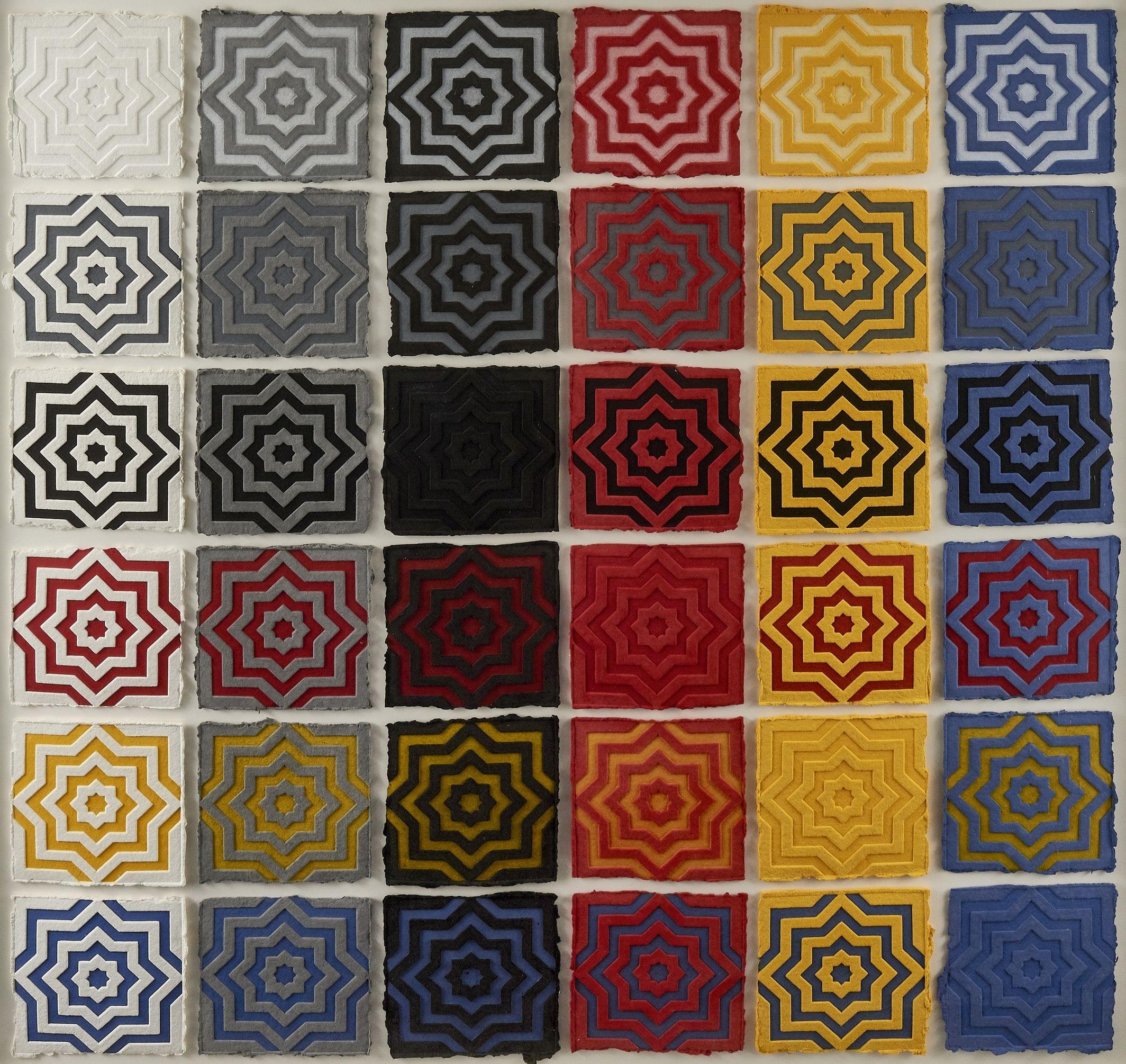 Eight pointed stars, 1996, série de 36 gaufrages sur papier (Handmade Twinrocker paper), signé et numéroté au dos du 36e panneau, édition de 15, éditeur: Two Palms Press, New York and Sol LeWitt, imprimeur: Two Palms Press, New York, New York, 137,2x137,2 cm. On joint une matrice ayant servi à la réalisation de l'oeuvre. Catalogue raisonné 1996.21
