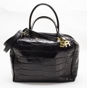 Cuir noir façon croco, intérieur en daim safran, un compartiment à double fermeture Eclair, double anse et bandoulière, attributs en métal doré. Nous joignons une longue écharpe violette bordeau Sonia Rykiel