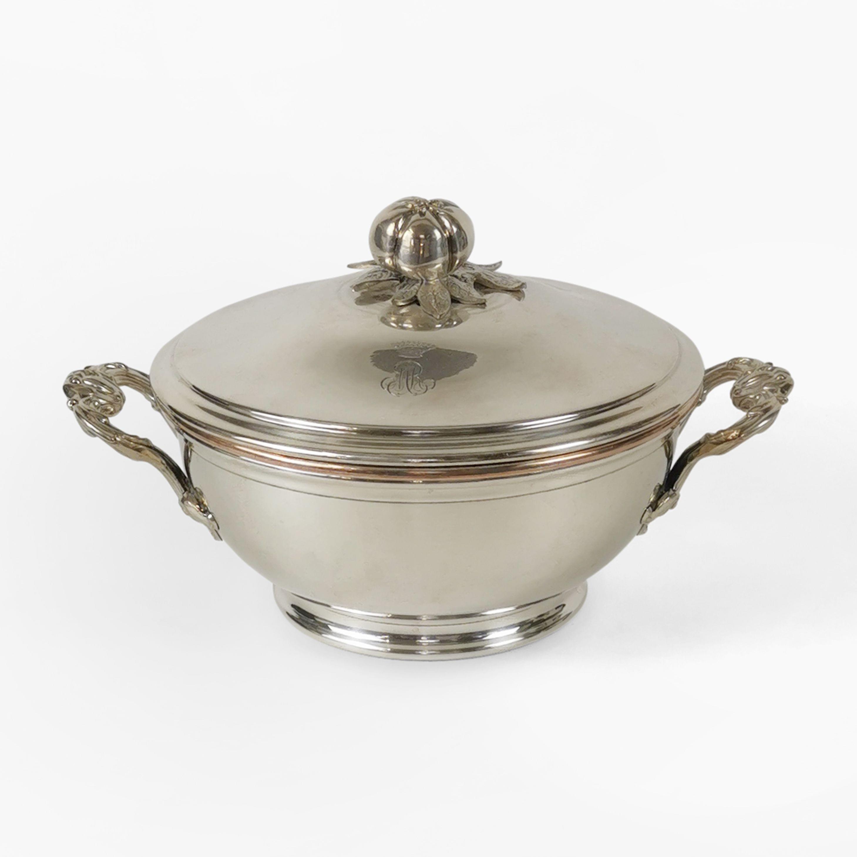 282. Soupière ronde néoclassique armoriée Vernet à frétel lion