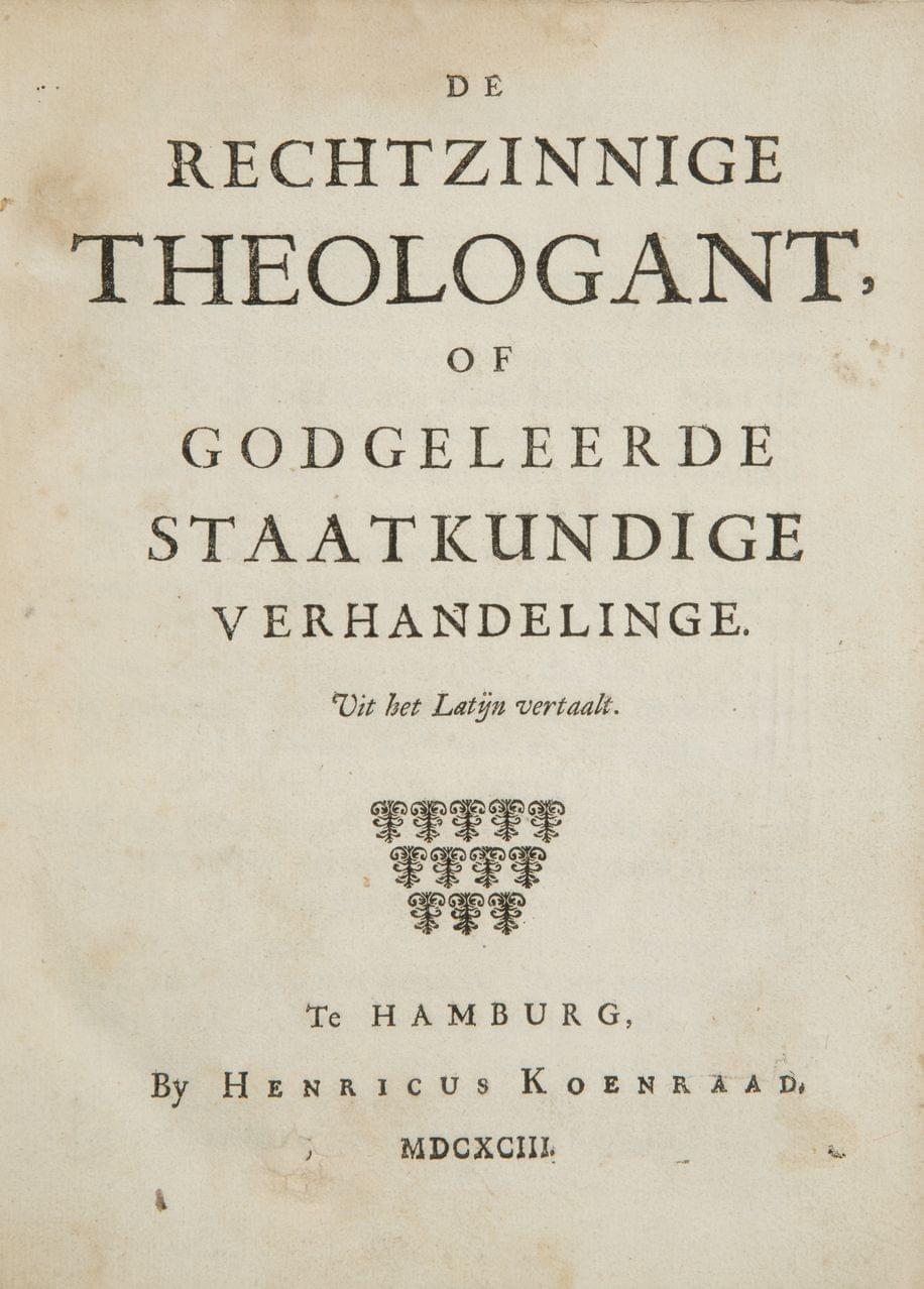 95. SPINOZA (Baruch): De Rechtzinnige Theologant, of Godgeleerde Staatkundige Verhandelinge. Hambourg, H. Koenraad, 1693;