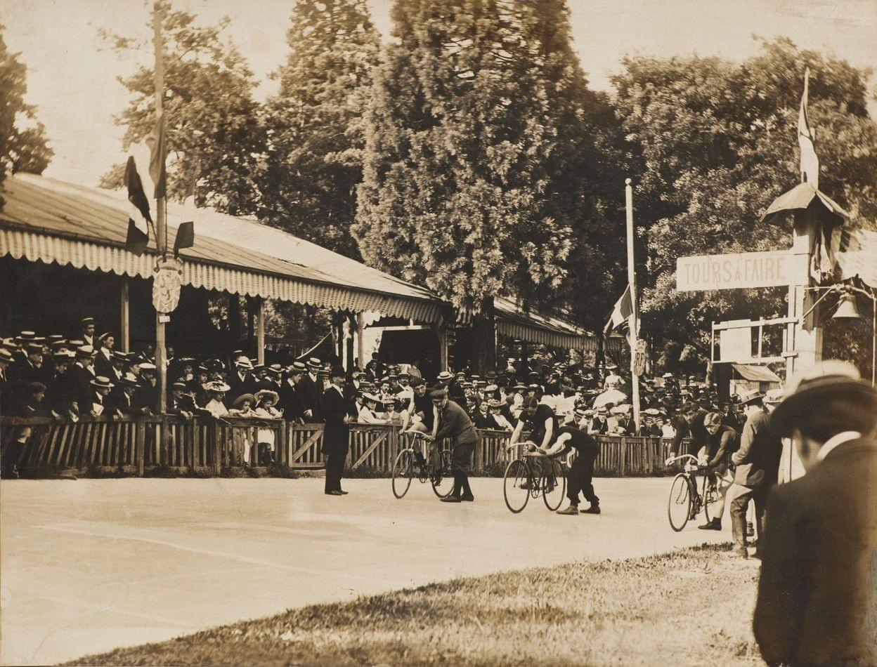 Grande photographie du départ d'une course cycliste en tirage argentique, vers 1900, 30x40 cm.