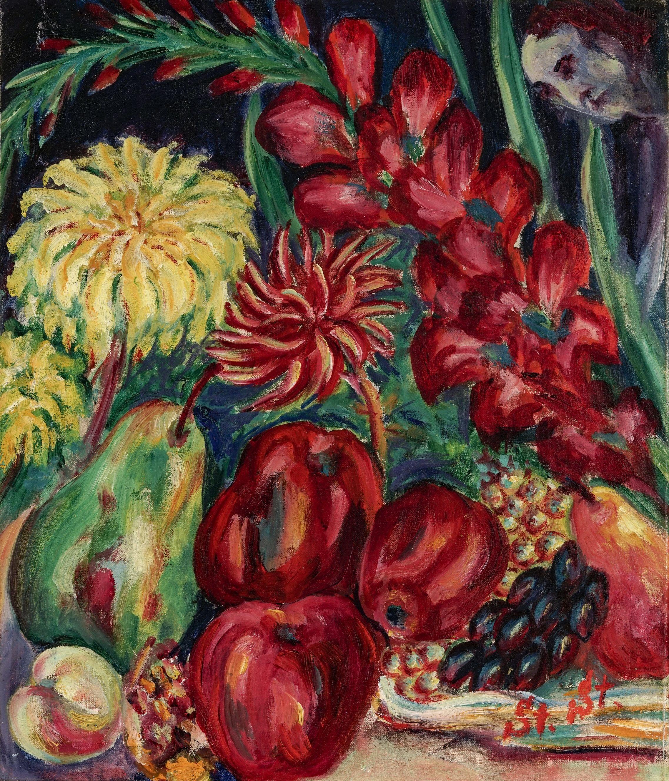 Nature morte aux fruits et fleurs, huile sur toile, monogrammée et signée au dos, 50x43 cm