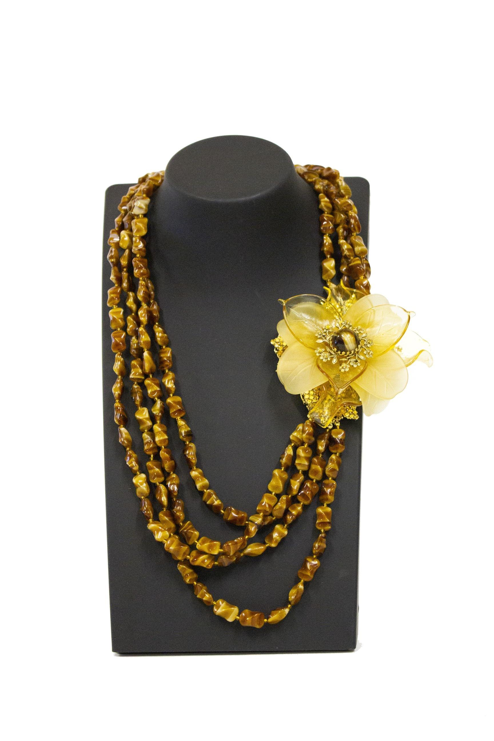 3210. Stanley Hagler, collier multi-rangs de perles de verre imitant l'œil-de-tigre et retenant un important motif de fleur aux pétales de verre