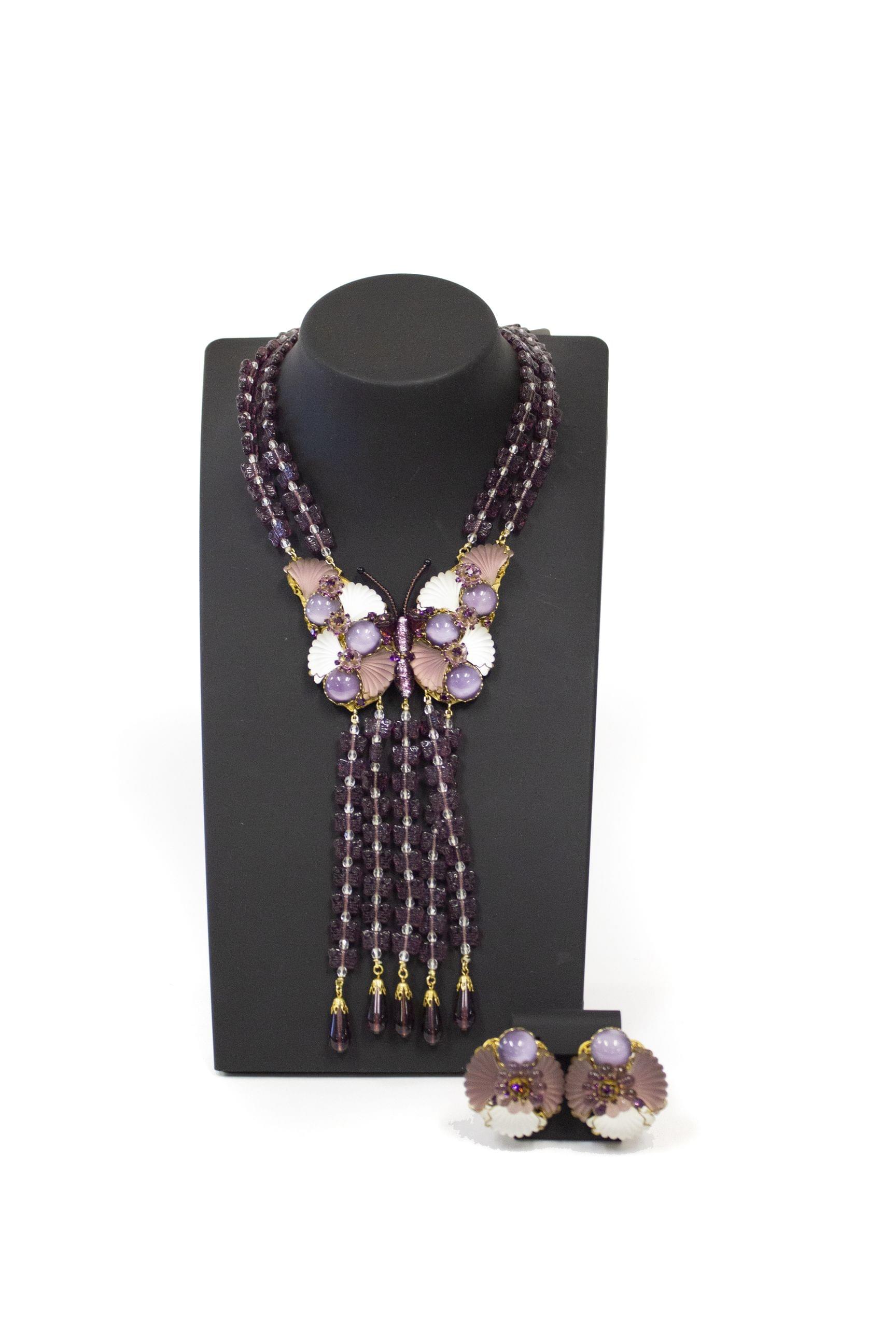 3208. Stanley Hagler, demi-parure comprenant un collier à double rang et des clips d'oreilles sertis de perles de verre violettes et roses à motifs de papillons