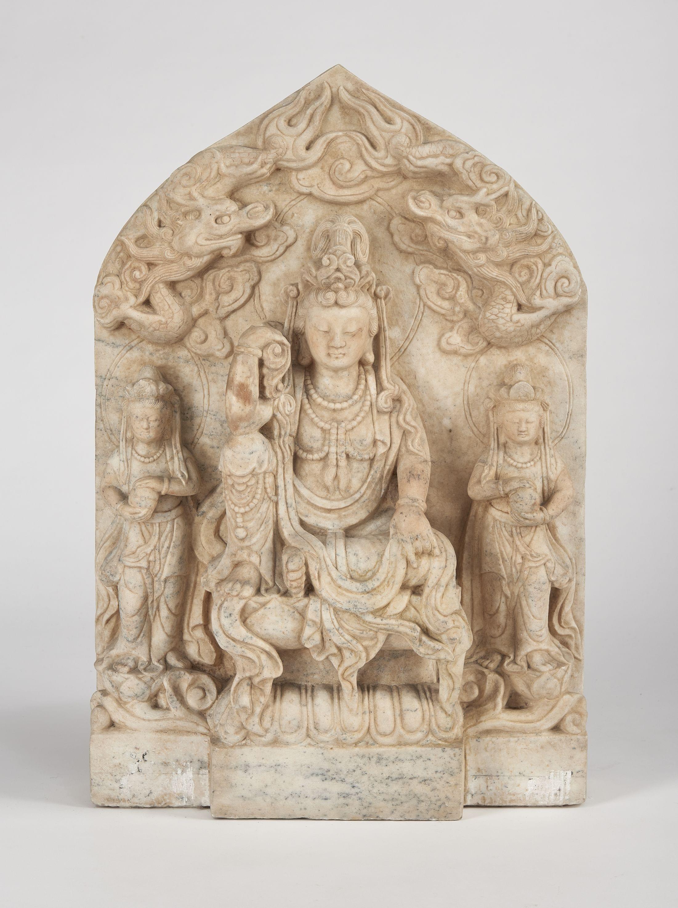 Marbre sculpté en bas relief à décor de Bouddha et de ses acolytes, 77x50 cm