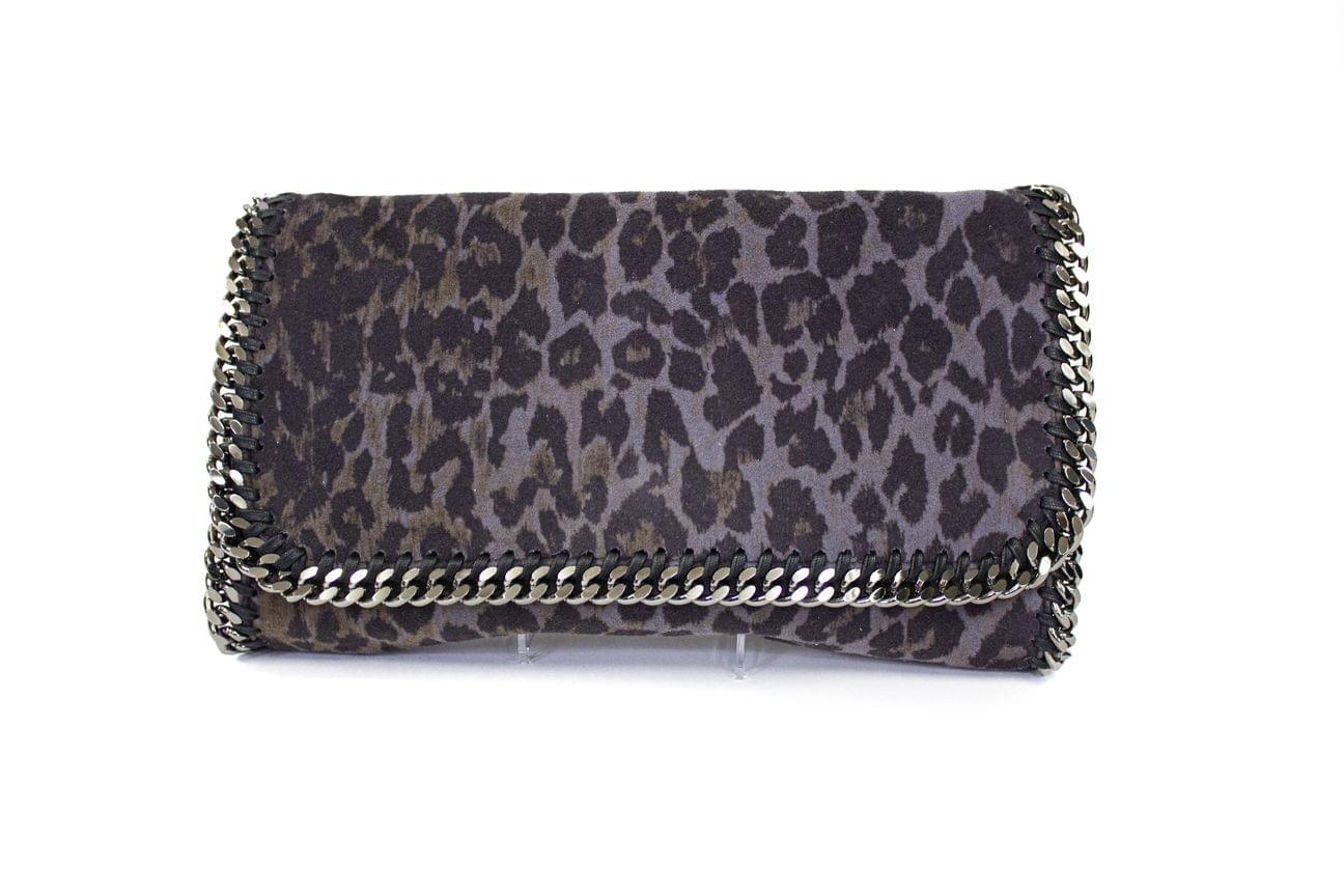 Tissu gris imprimé façon panthère, bandoulière en chaîne à maille gourmette, fermeture aimantée, 18x30 cm