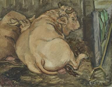Taureau à l'étable, huile sur toile, signée, 27x35 cm