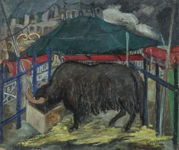 Le buffle et les éléphants au cirque, paire d'huiles sur toile,...