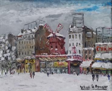 Neige à Paris devant le Moulin Rouge, huile sur toile, 1968, 32x...