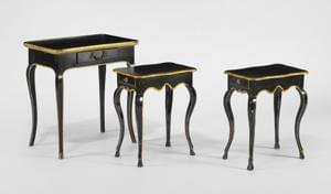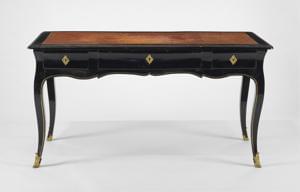 Bois laqué noir et filet de laiton, cuir fauve doré aux petits f...